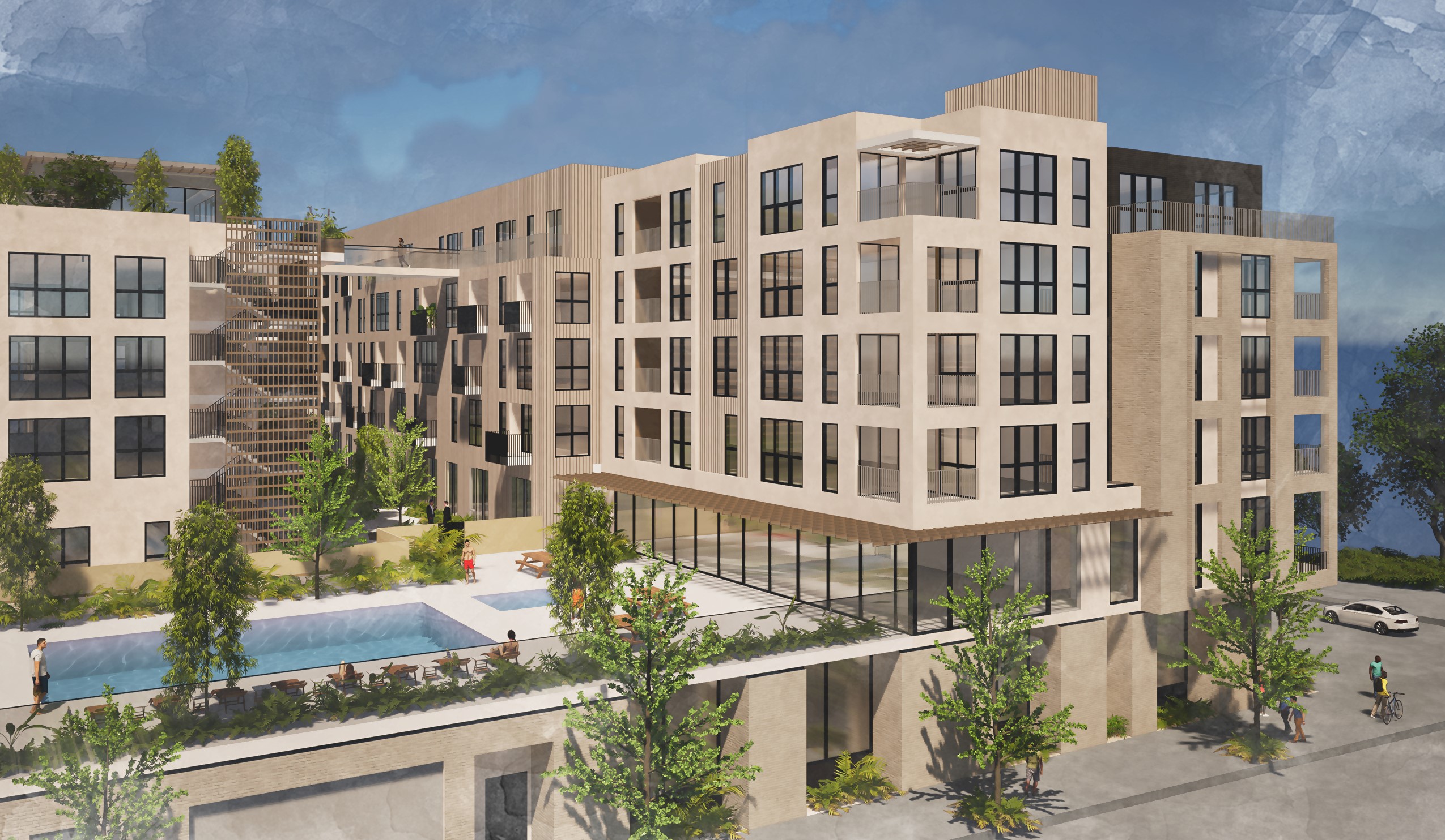 A new 40-unit residential building proposed for a site near the soon-to-be-reimagined Broadway Autorow district of Oakland. This development is planned with a variety of interesting exterior social spaces, including a courtyard for use by all residents and smaller balconies and terraces for use of smaller groupings and subsets. These smaller spaces are unified behind mesh screens, filtering the strong sun of Oakland, creating enjoyable microclimates.